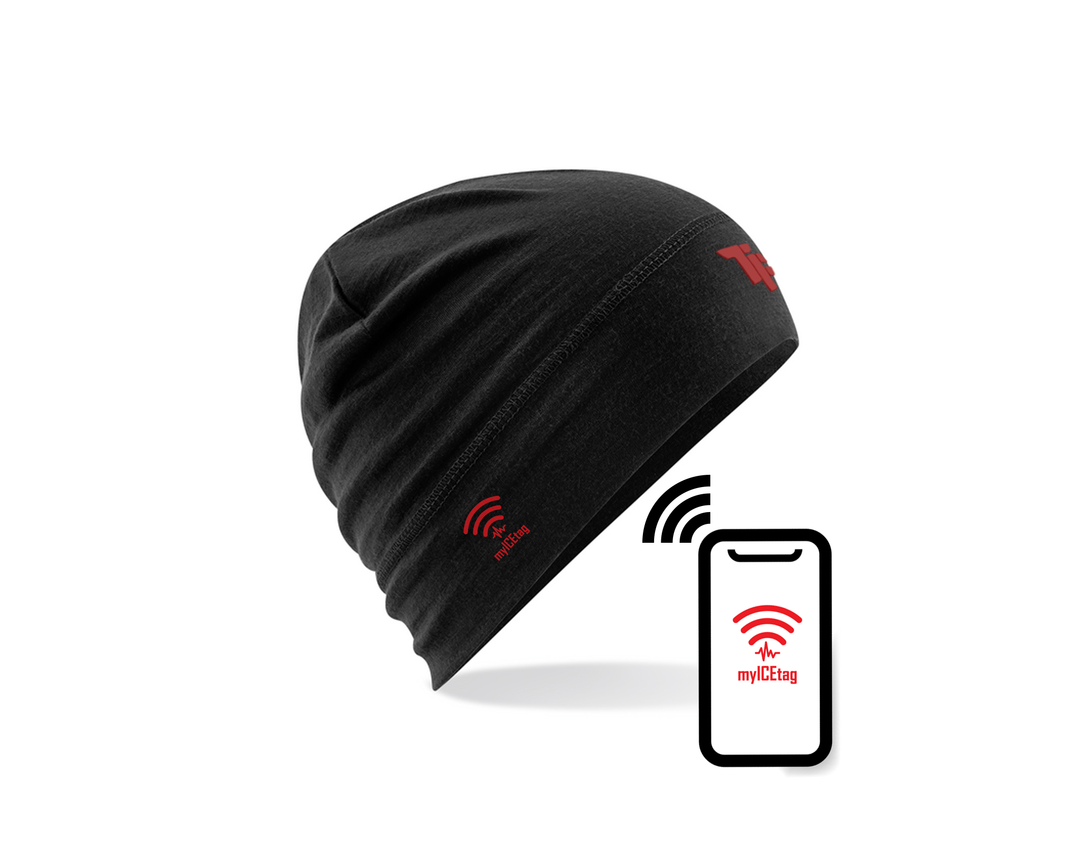 ICE stands for “In Case of Emergency.” The NFC tag lets a rescuer open your emergency profile by tapping a phone to the beanie.