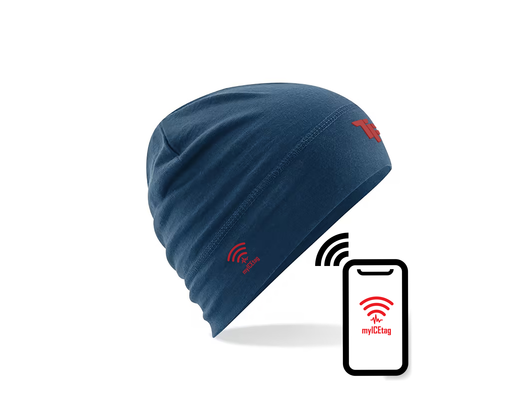 ICE stands for “In Case of Emergency.” The NFC tag lets a rescuer open your emergency profile by tapping a phone to the beanie.
